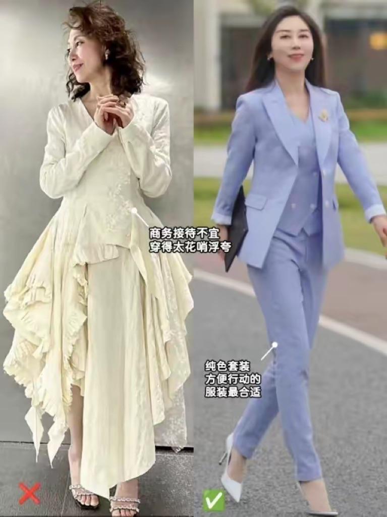 淺藍色、淺粉色、淺黃色、或者淺綠色的西服套裝,都適合成熟女性。低飽和度的色彩,溫柔又減齡。用西服套裝配白色高跟鞋,也特別顯高提氣質。