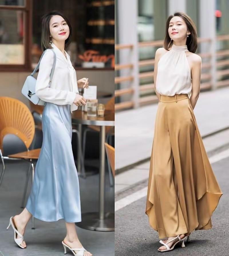 高腰的半身裙,可以選擇垂順的醋酸面料。以醋酸半身裙,配低跟的涼拖,露出腳踝和腳背的線條,讓整體穿搭都變得輕盈惹眼起來。