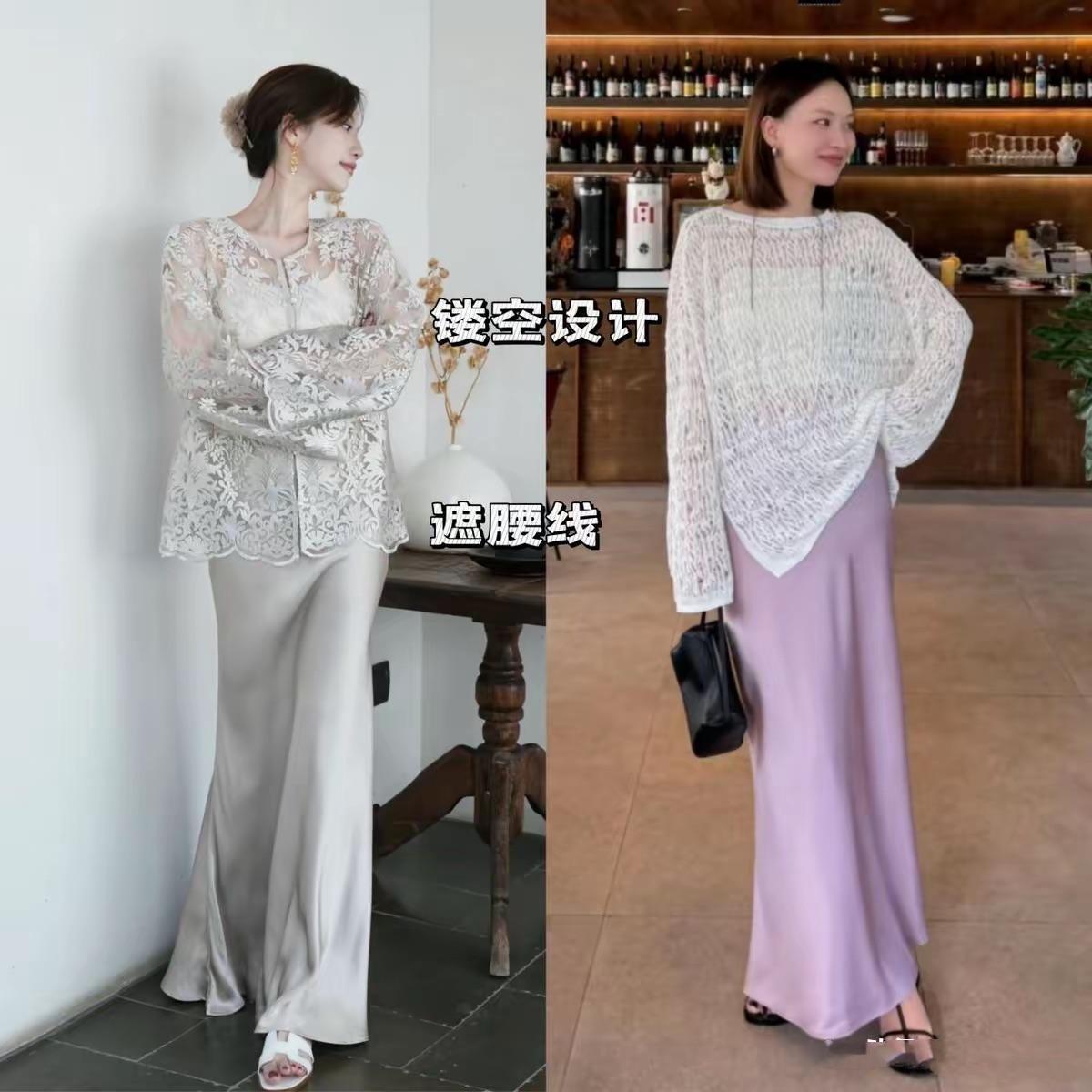 用鏤空的蕾絲罩衫來搭配醋酸裙,是一種溫柔浪漫的美。淺色系的蕾絲罩衫,配上高腰的醋酸裙,順色搭配顯高級、撞色搭配更輕盈靈動。