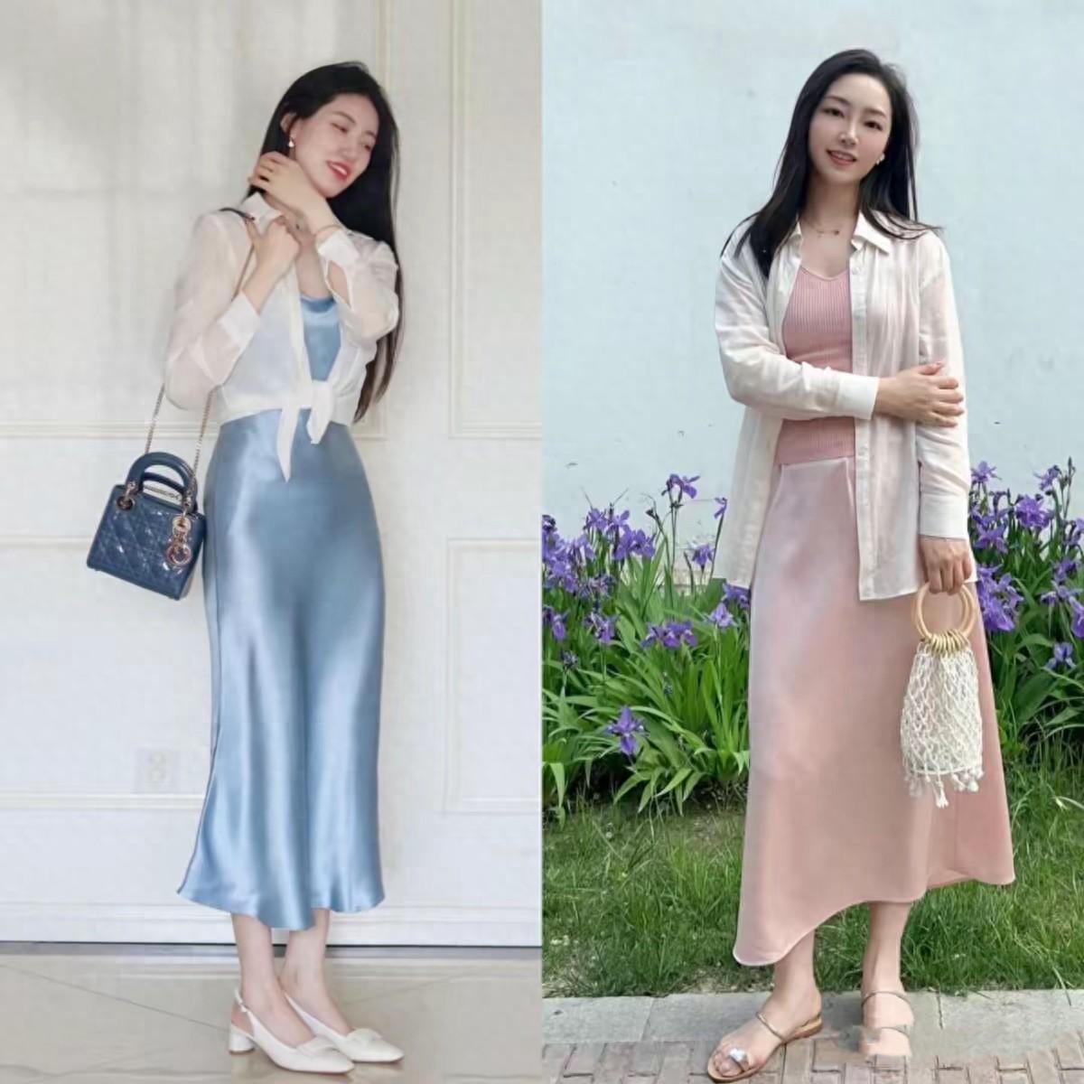 不管是30歲還是50歲,穿衣搭配都應該大方不浮誇。醋酸裙的色彩、奠定了更高級的視覺體驗。優雅的米白色、淺杏色、淺藍色、深黑色都是非常容易搭配的高級色。
