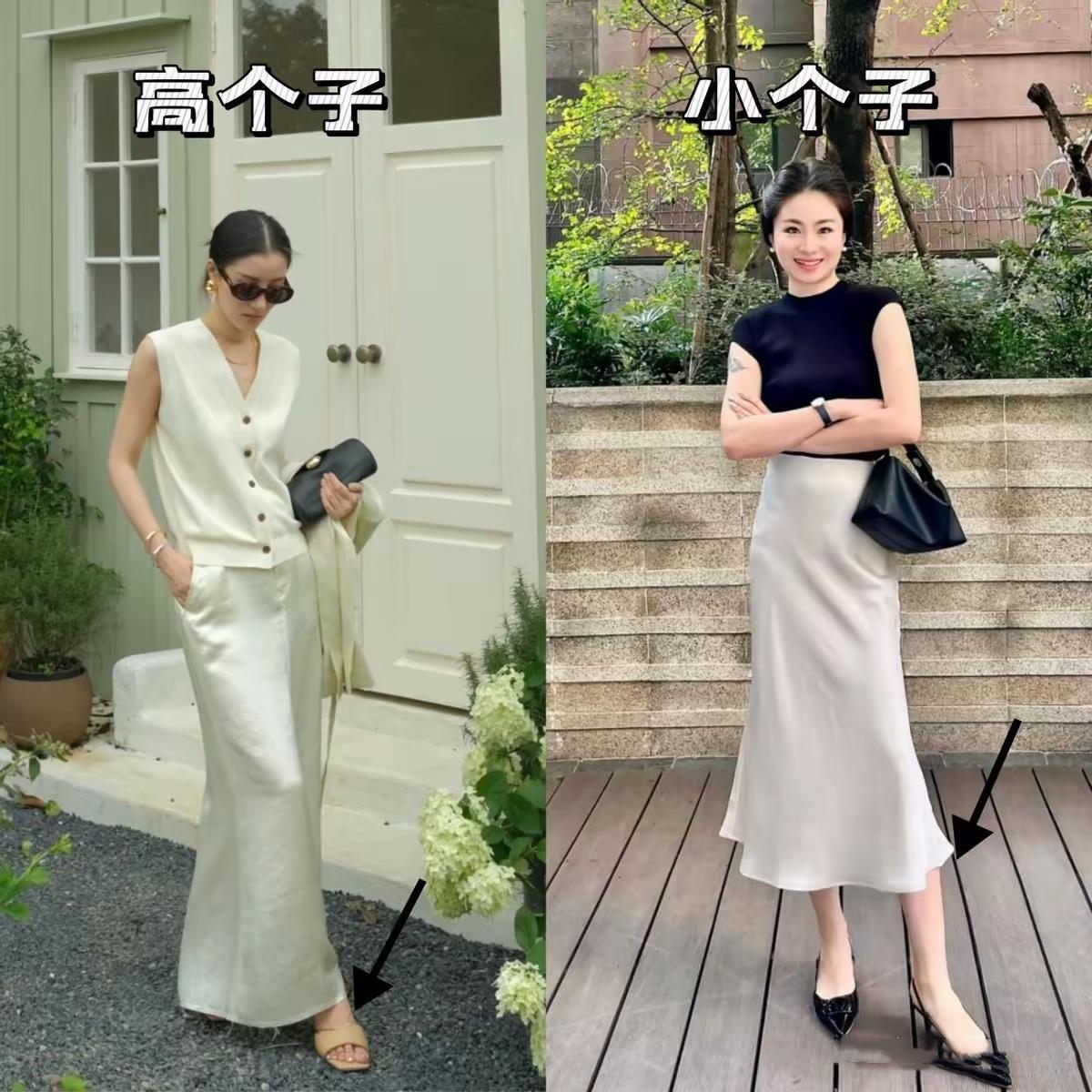 及踝的醋酸裙,穿起來是溫柔又隨性的,有一種慵懶大氣之美,也更加適合高個子。剛剛覆蓋膝蓋的醋酸裙,則更加適合小個子女生,優雅中的帶着幾分空靈,特別的顯高。