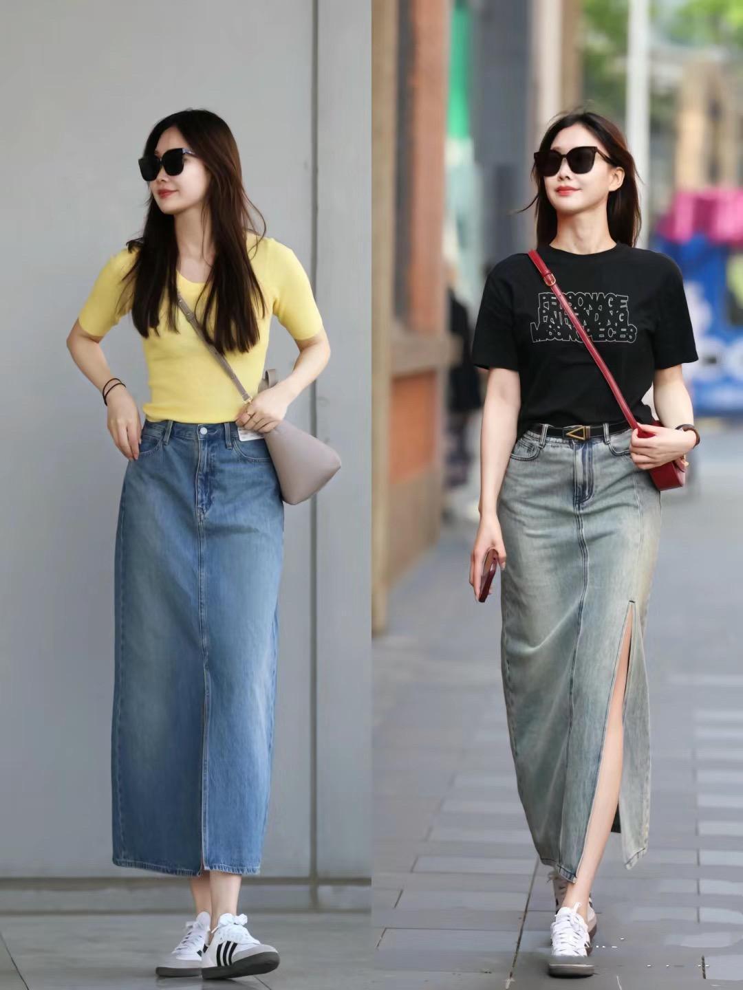 像這種基礎款的純色T恤,自然可以與風格屬性明顯的牛仔半身裙進行匹配。不管是修身的、還是寬鬆的T恤,搭牛仔半身裙都自帶腔調感。