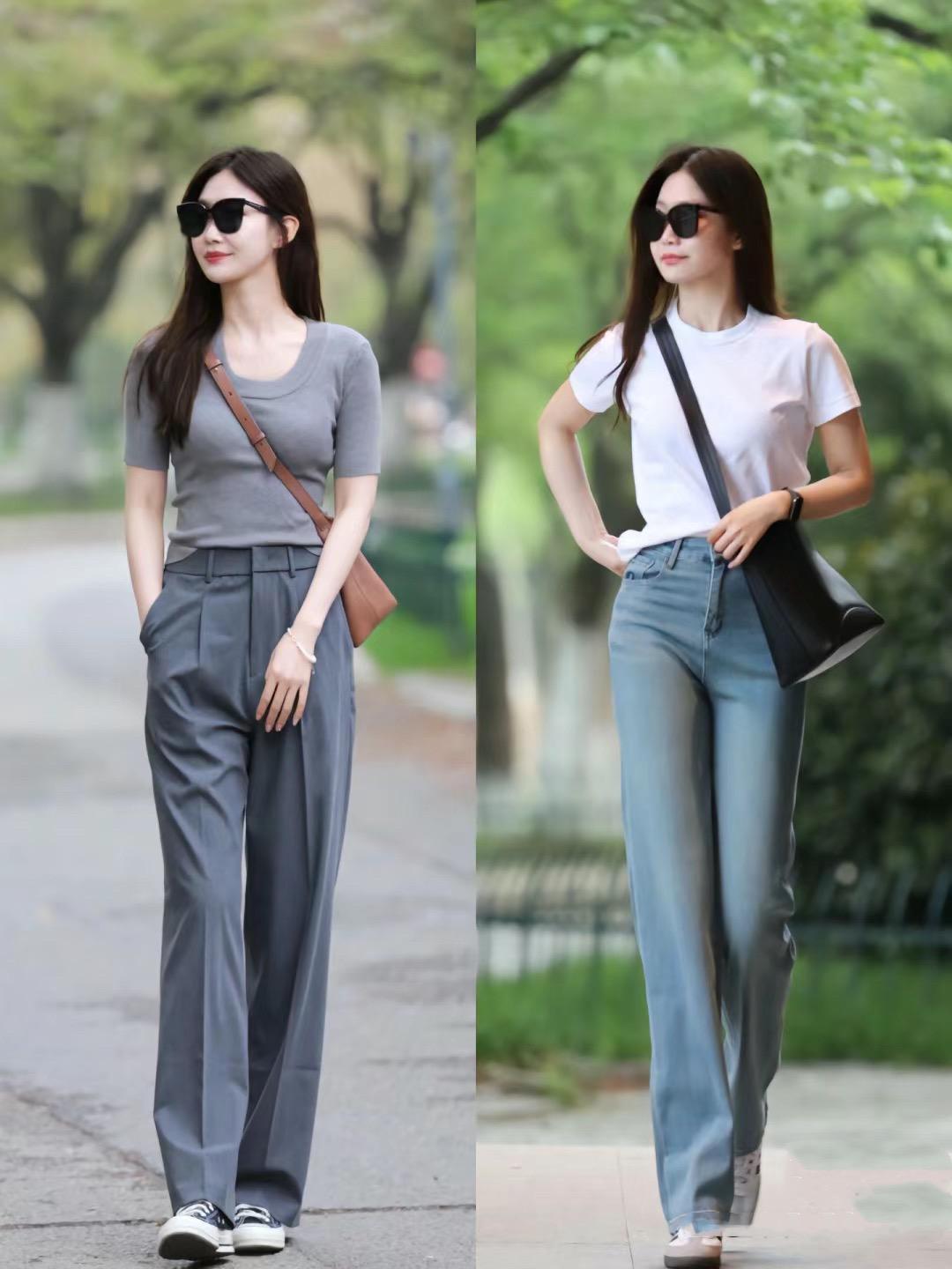 修身一點的T恤,搭配西裝闊腿褲,是一種溫柔又高級的組合。上緊下松的穿搭look,也會給人一種時尚感。身材豐腴的女人,也可以多穿修身的T恤,塑造出曲線美。