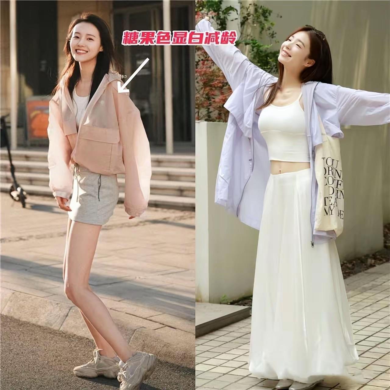 比如淺粉色、或者淺紫色的防曬衫,穿起來都比較大溫柔甜美。這種淺色防曬衫,也與淺色系衣服更搭,比如白色吊帶配淺色防曬衫就顯白減了、提氣色。