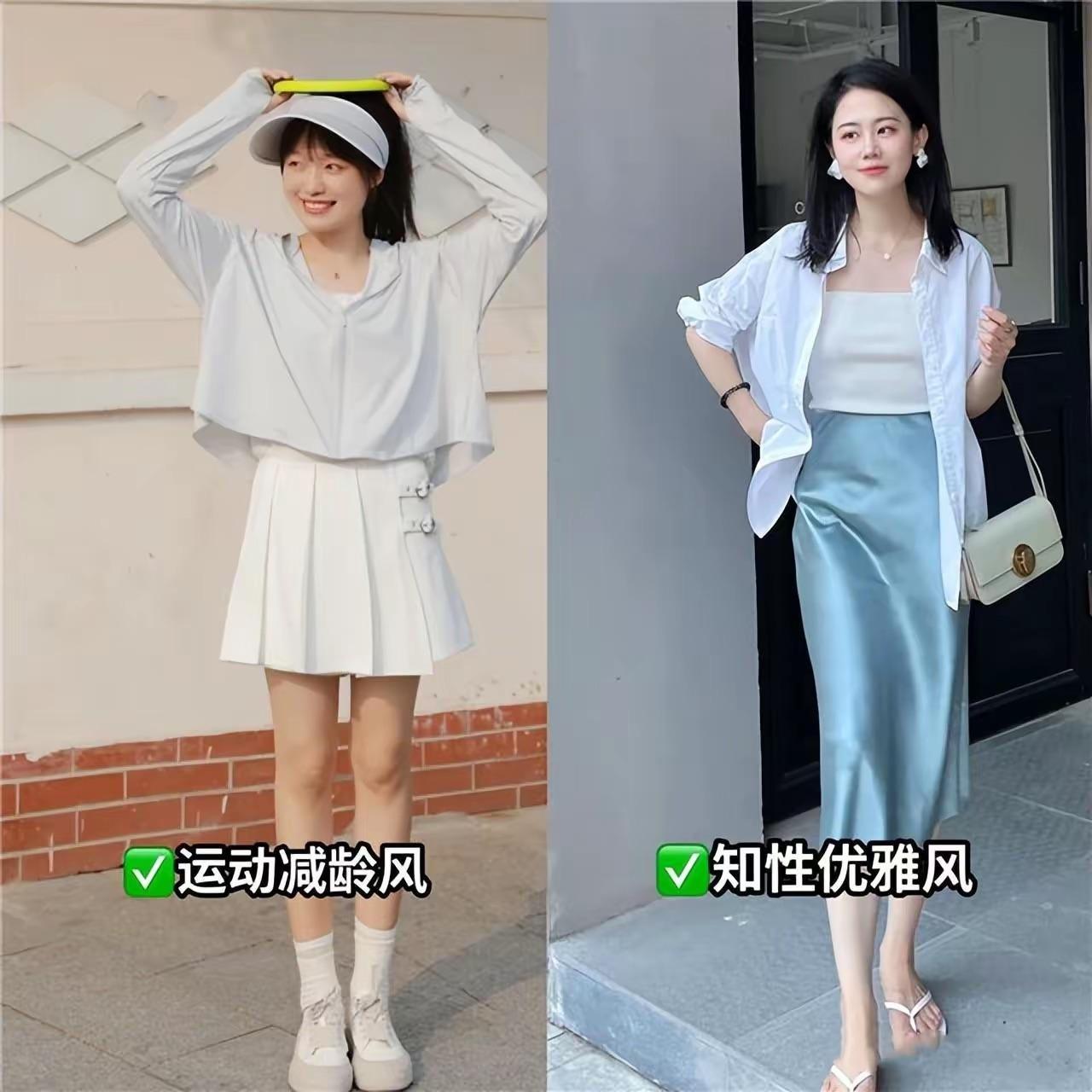 如果是小個子,自然更加適合短款的防曬衫,配白色百褶短裙,俏皮可愛又非常清爽醒目。優雅知性的穿搭,自然可以用襯衫版型的防曬衫配醋酸裙了、體面還顯貴。