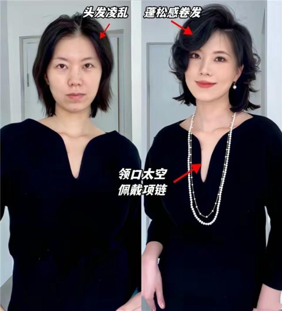 相對於凌亂的頭髮,帶有層次感的微卷短髮、必然更加洋氣。化妝後整個人熠熠閃光,極簡風的黑色連衣裙,配上疊搭的珍珠項鍊、高級又顯貴。