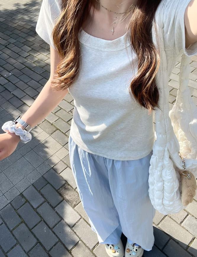 灰白色的正肩短袖t恤,看起來就很好搭配衣服,衣服的透氣性也是極佳的,選擇奶藍色闊腿褲相配,簡簡單單的就很好看。
