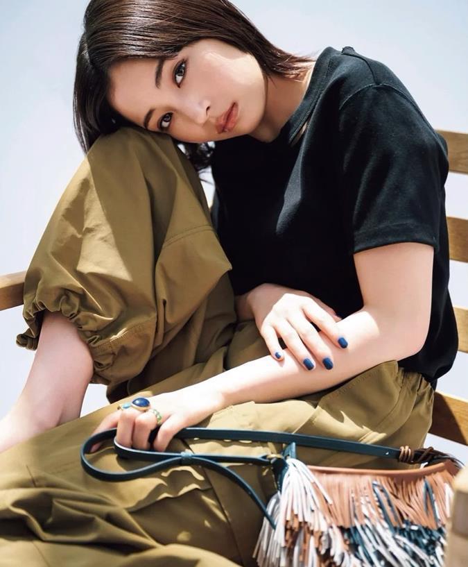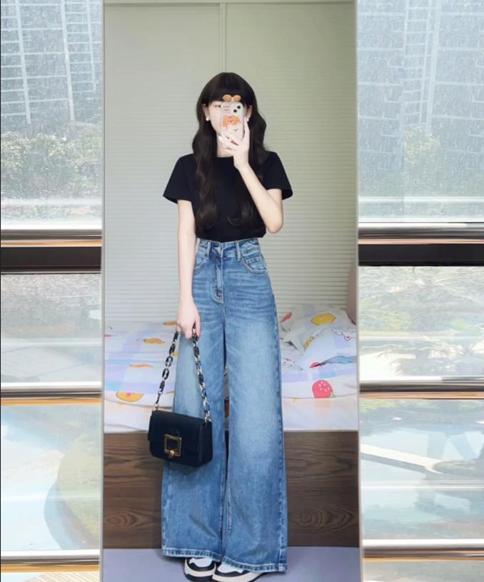 黑色t恤+牛仔闊腿褲,夏天簡單穿就可以,上短下長的基礎穿法,真的太適合小個子女生了,正肩的設計,有助於修飾上身的比例,穿起來後整個人都變得精神起來。