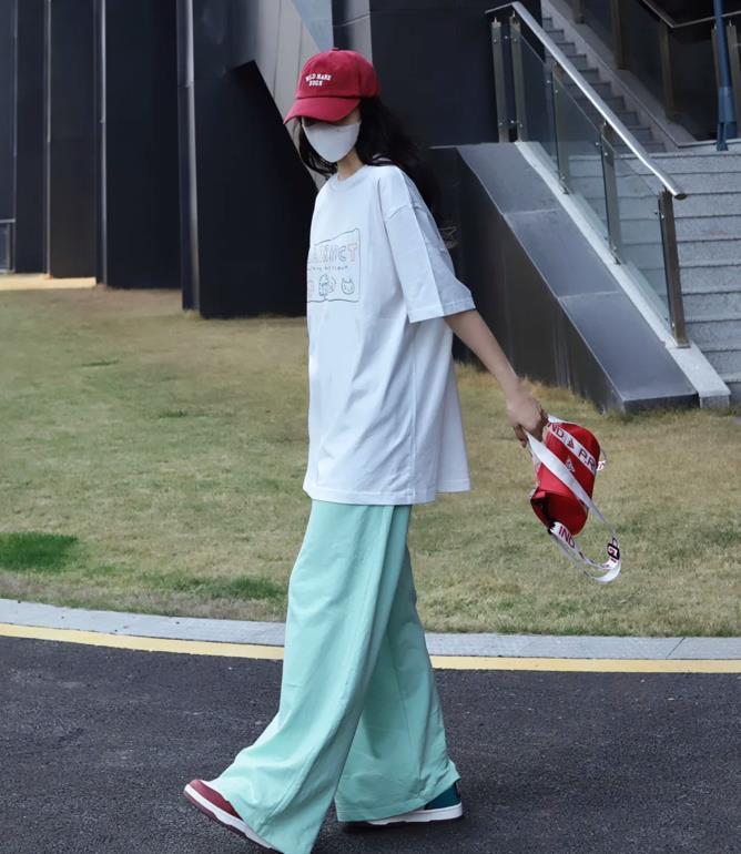 乾淨的白色t+薄荷綠休閒褲,清爽又吸睛,舒適度直接拉滿了,薄荷奶綠的休閒褲,穿起來太減齡了,和上衣配在一起剛好。