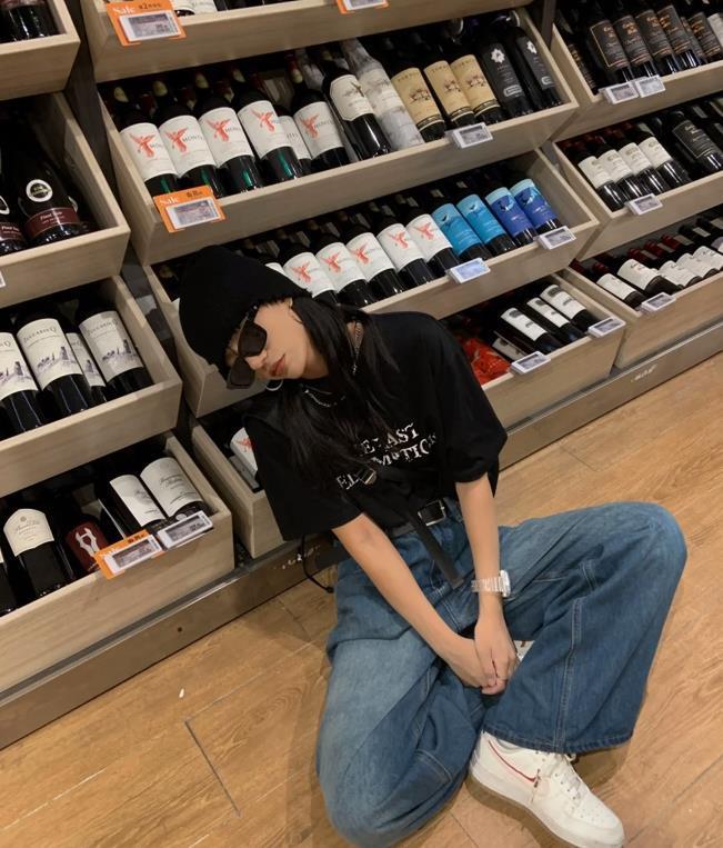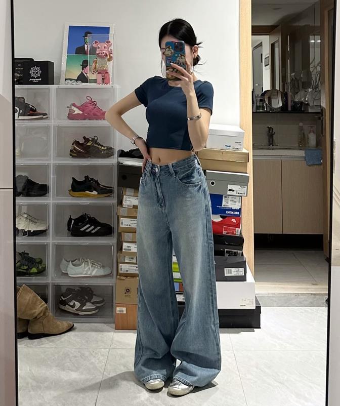 上短下長的搭配,是最能優化整個身材比例的,也能輕鬆打造出高挑感,短款基礎款T恤+高腰牛仔闊腿褲,有種很慵懶隨性的調調,視覺上能讓你的身材比例看起來更修長。