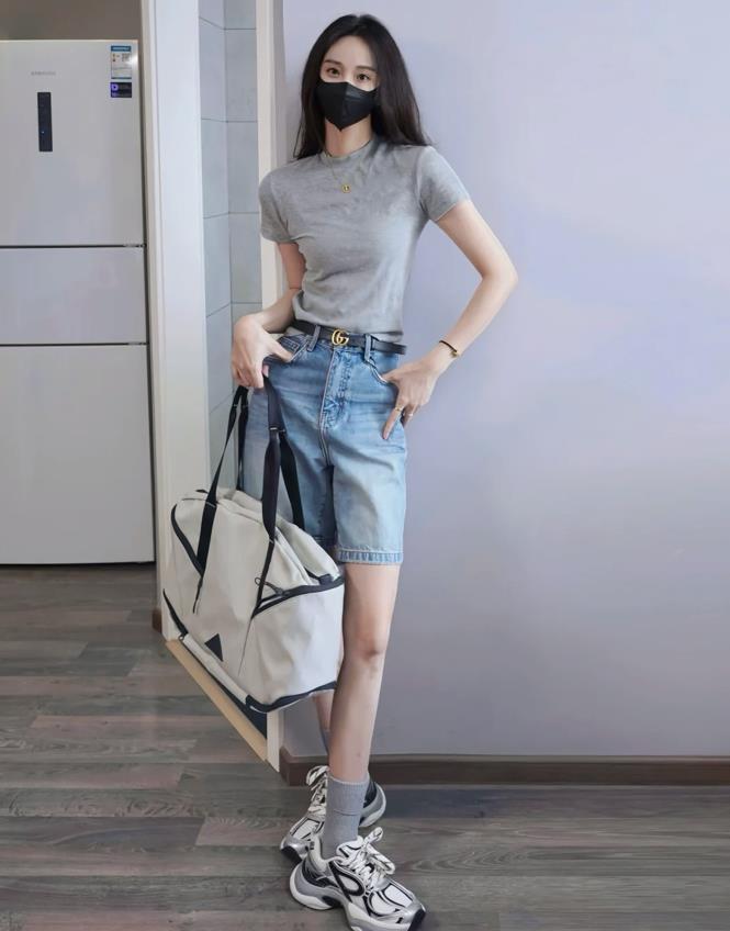 面對悶熱高溫的天氣,t恤+短褲的搭配就是最合適了,灰色正肩t恤+牛仔短褲,腳下是一雙運動鞋,日常休閒這樣穿,真的非常不錯。