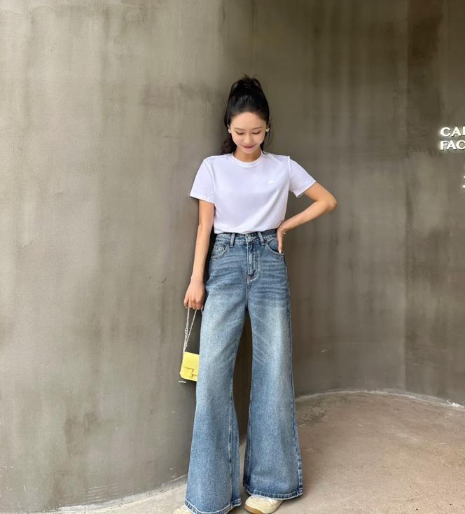 穿不膩的白t恤,和牛仔褲組合在一起,真的很舒服啊,上衣是一件正肩t恤,乾乾淨淨的,版型寬度適中,十分顯瘦遮肉。搭配起一條闊腿牛仔褲,遮胯又顯瘦,小個子女生穿記得把腰線提高起來。