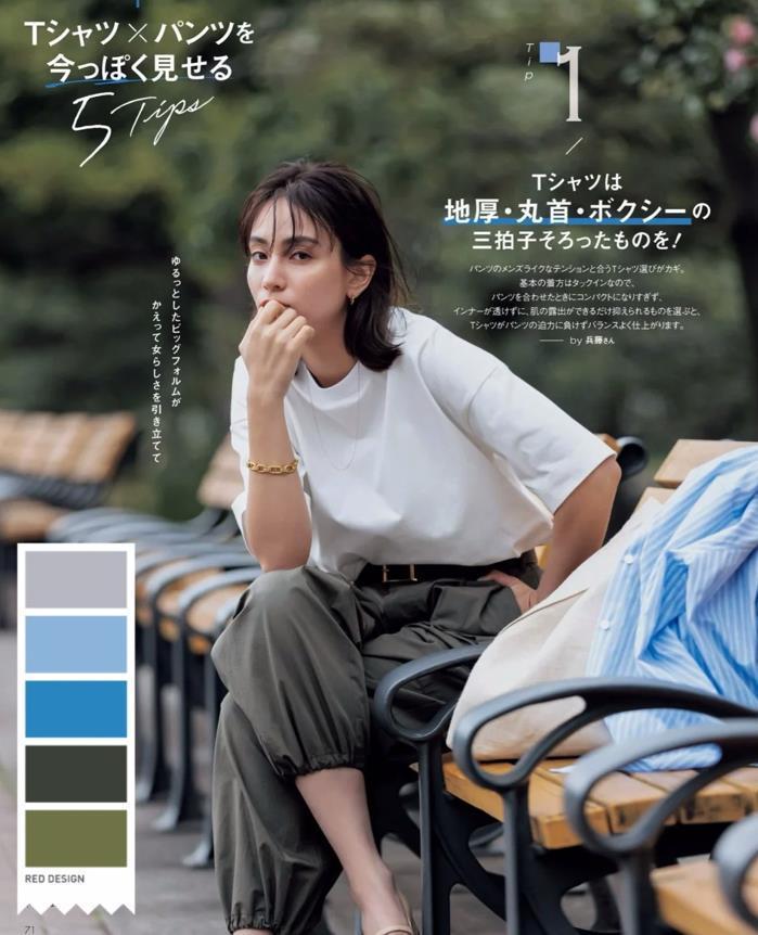 T恤這種百搭款上衣,其實無論與什麼樣的下裝相配,都是沒有違和感的,想要讓你自己的穿搭看起來更清新一些,可以在配色上下手。