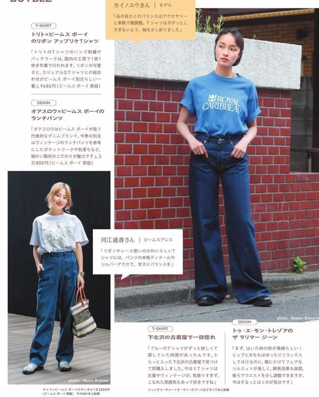 乾淨的白色t恤,真的是無論穿多久都不會膩,當然,最重要的是很不挑人,選擇正肩的款式,可以把你的肩頸線條修飾得剛好,搭配水洗牛仔藍褲子相配,很清新又自然,闊腿版型的牛仔褲,對身材具有極佳的包容性,遮肉又顯腿長。