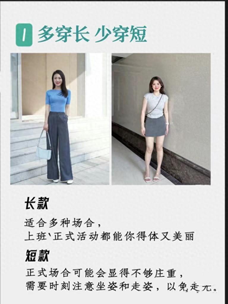 長款的裙裝、或者褲裝,可以滿足多種場合需求,既大方得體又優雅美麗。而短款的裙裝、則不夠莊重,也很容易暴露下肢不足,並且時刻需要保持坐姿,防止走光。