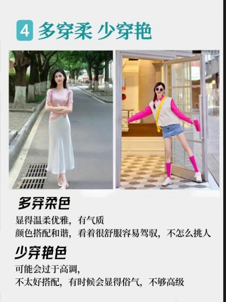 多穿柔,少穿豔,是指服裝的色彩。夏天雖然服裝用色比較大膽,但也不建議穿的太過高調,亮度太高的顏色,容易顯得土氣不夠高級。