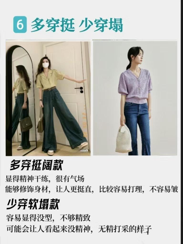 少穿塌,建議大家少穿面料軟塌的服裝。面料軟塌的服裝,不夠精緻、顯的整個人也沒有精神、氣場不足。
