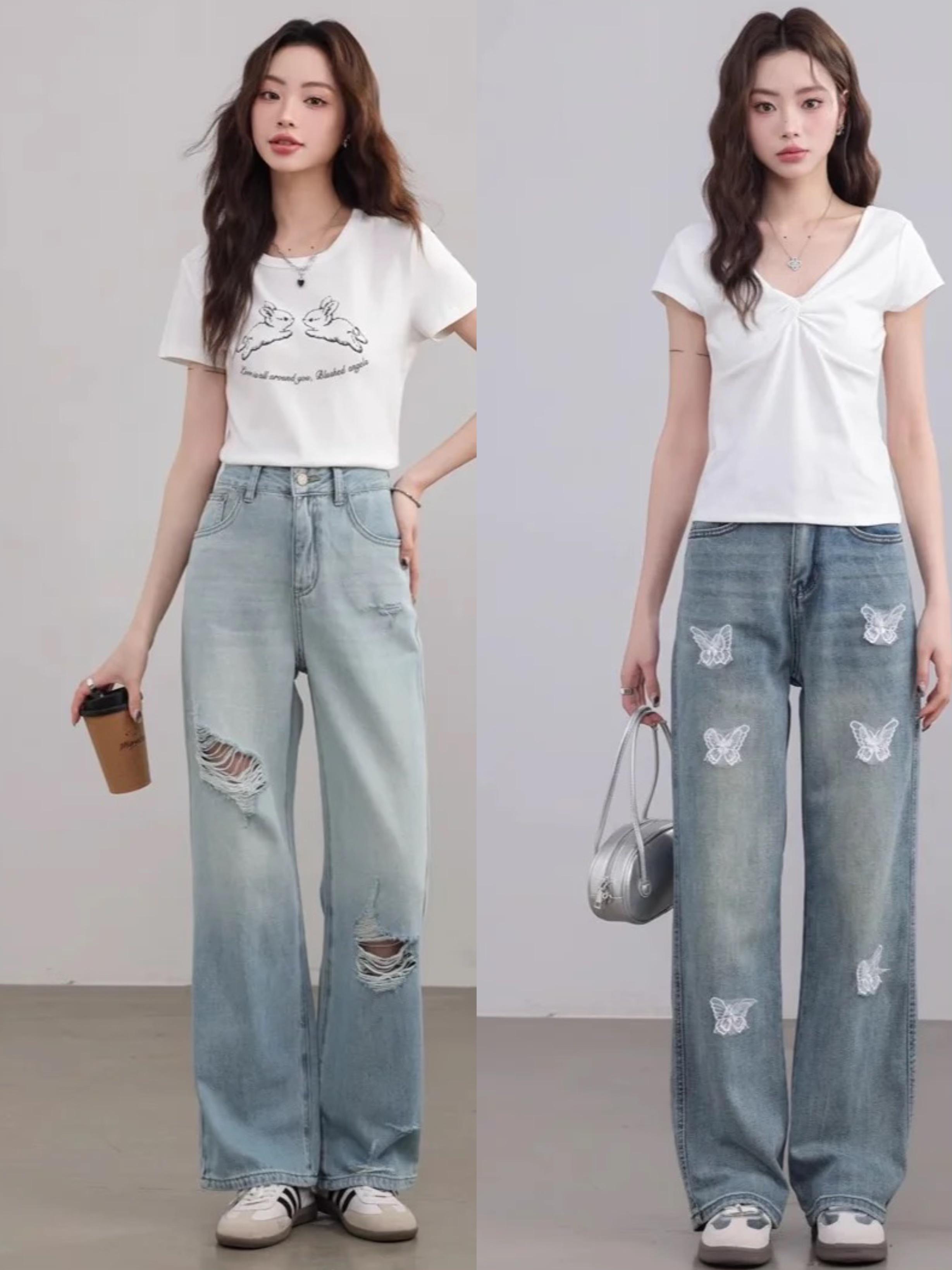 比如增加了破洞元素、或者刺繡裝飾的牛仔褲,就更加時髦俏皮一點。我們選擇這種破的牛仔褲的時候,建議搭配基礎款的T恤,尤其是白色T恤更顯清爽。