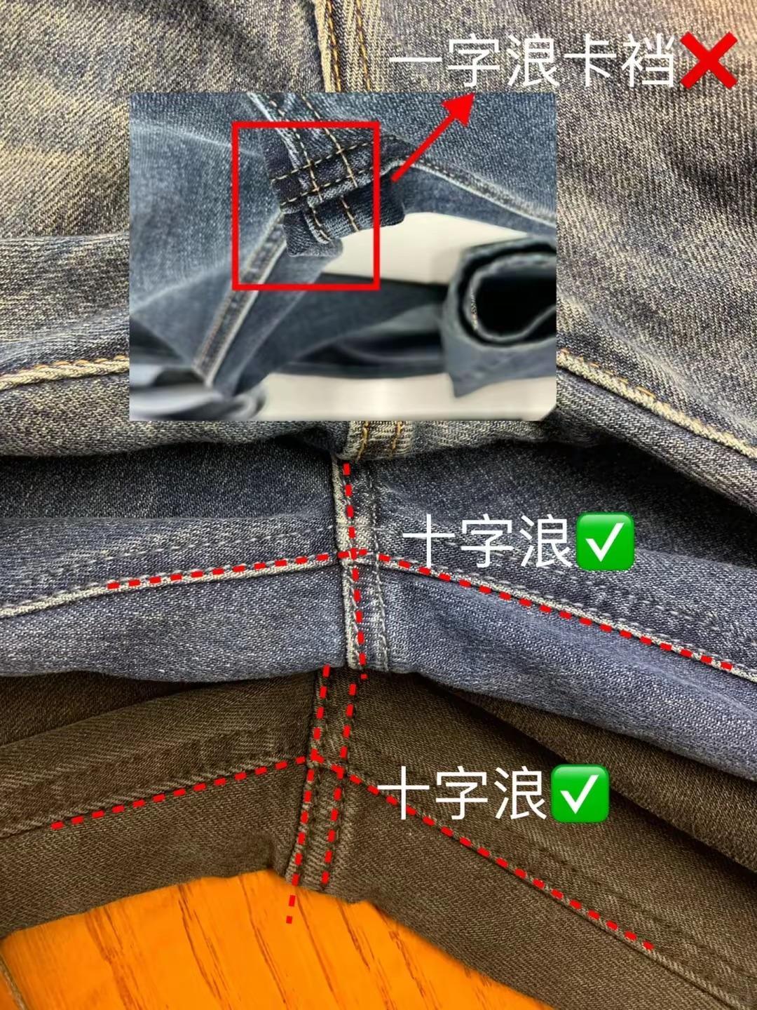 一般而言幾十塊的牛仔褲,會選擇一字浪的襠部走線,穿着過程中空隙感就不足,很容易卡襠。相對而言,幾百塊的牛仔褲大都會選擇十字浪的襠部走線,不容易卡襠、舒適度更強。