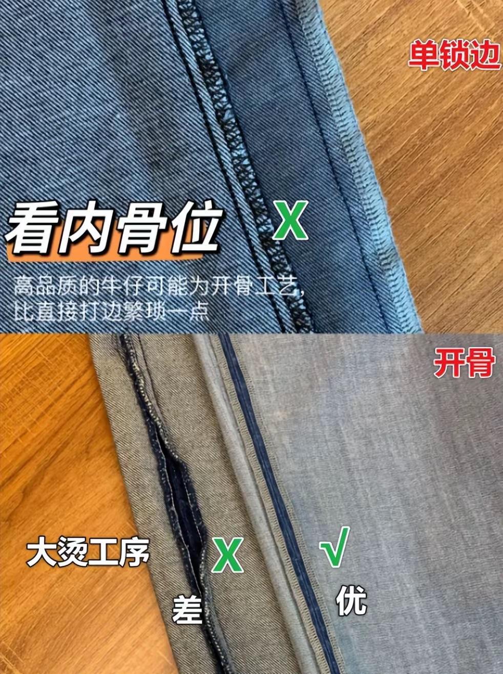 幾十塊的牛仔褲,一般都是直接打邊的單鎖邊工藝,而高品質的牛仔褲會選擇開骨工藝,並且加入大燙工序,整體流暢度也會更強。
