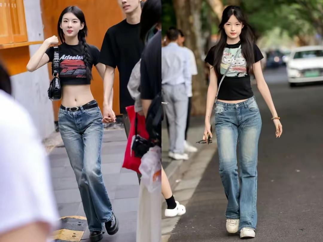 露臍款的T恤,看似保守卻更加活潑。一露臍款T恤配直筒牛仔褲,也是胸衣+露胯褲的升級版,搭一雙厚底的鞋子,抬高海拔、自然顯腿長。