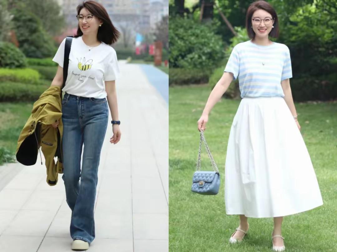 想要清新減齡的美,我們也可以嘗試用純色T恤來凹造型。