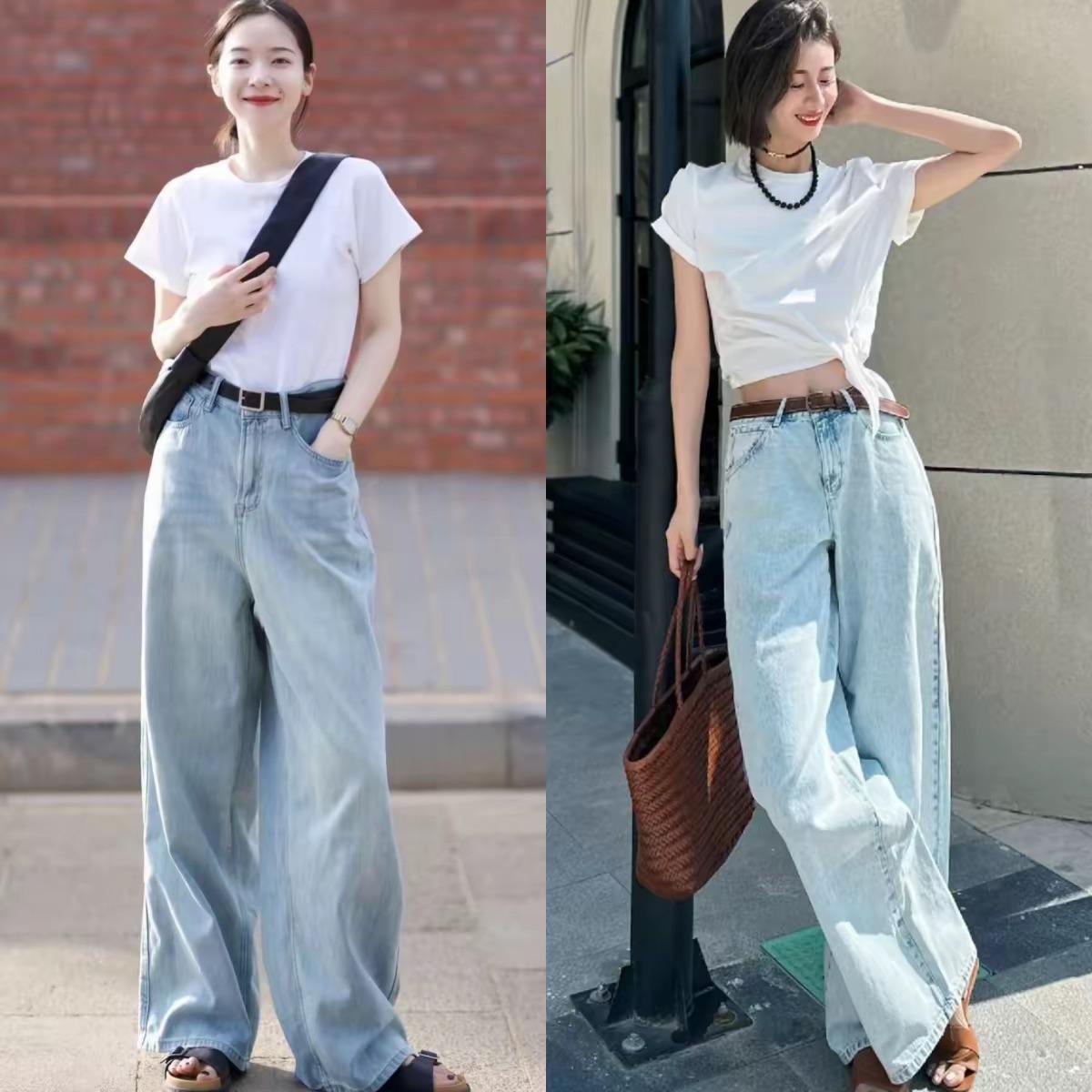 高腰的闊腿牛仔褲,清新的淺藍色系、穿起來時髦中帶一點酷感。