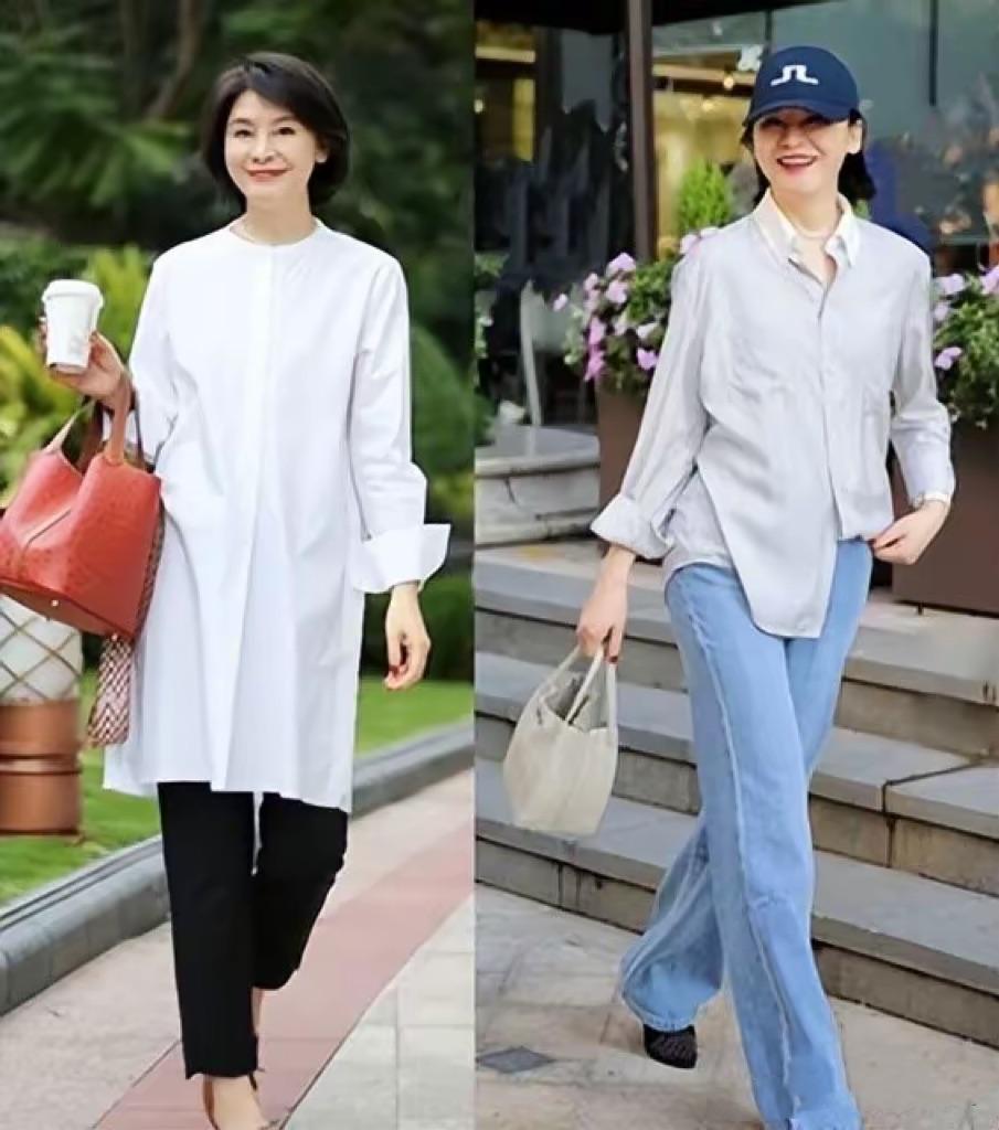 經典的黑白配、或者藍白配色,都是高級不過時的。如果擔心常規的白襯衫不夠洋氣,我們可以選擇長款的個性白襯衫。