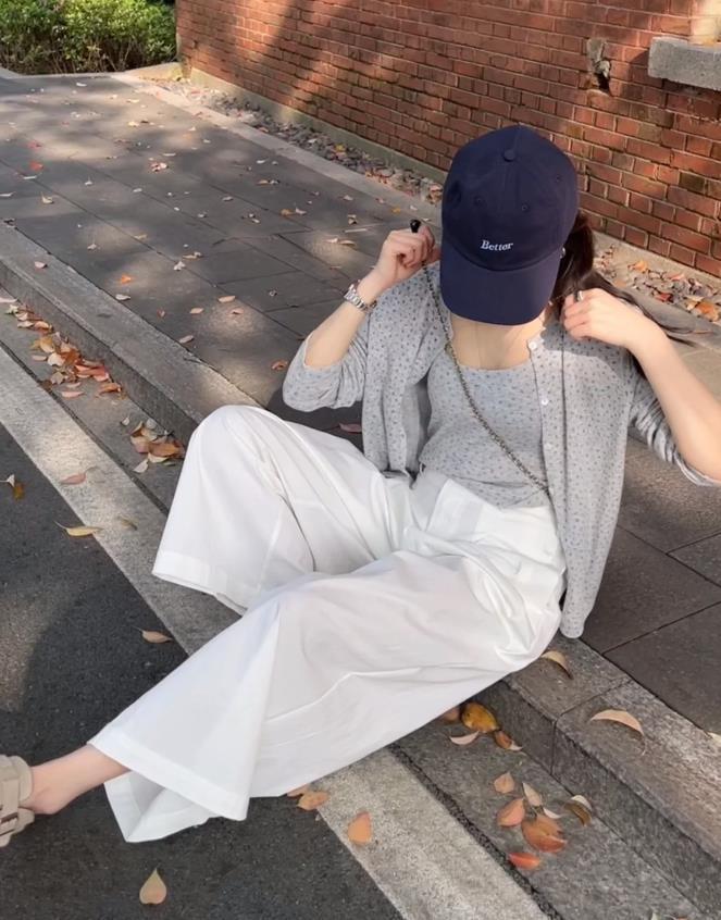 這一套穿搭,看着就很養眼啊,灰色與白色的配色,不僅時髦舒適,還帶着高級感,上衣是細膩柔軟的背心+開衫,搭配一條闊腿九分褲裝,舒適度直接拉滿了。