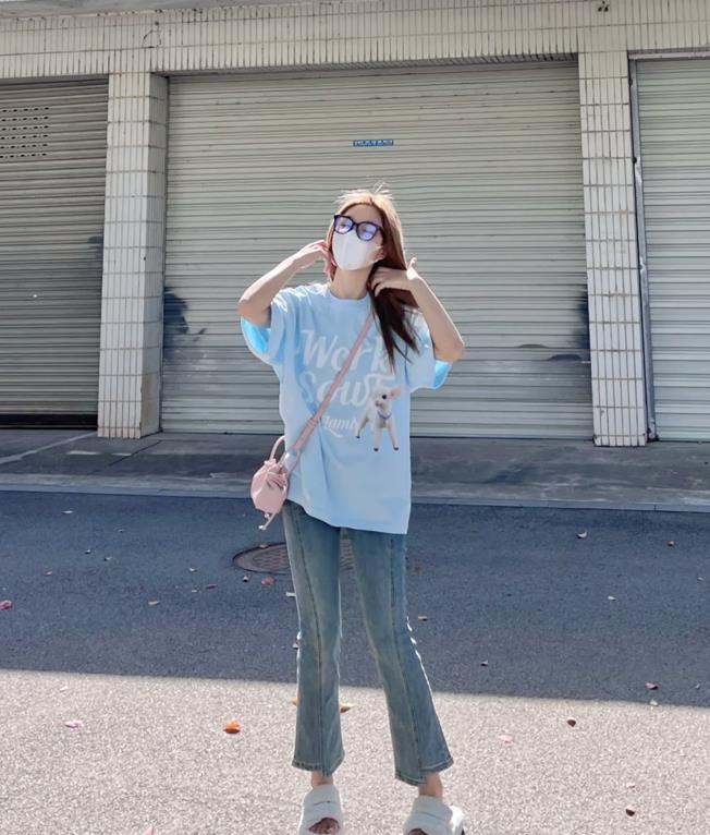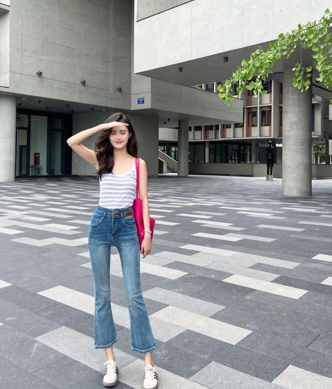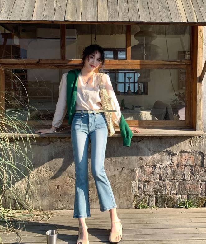 有些偏法式風的穿搭,看起來就很心動,微喇牛仔九分褲,除了經典之外,更多的是對腿型的包容和修飾。即便如此,也建議你將腰線提高一下,有助於拉長腿部線條,搭配法式襯衫,真的很顯精緻和氣質。