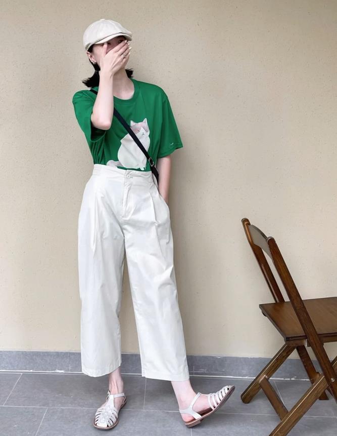 不喜歡穿闊腿褲的姐妹,可以試試這種蘿蔔褲,今年也非常流行呢,九分的長度,讓你輕鬆打造出高挑感和顯腿長。上衣簡單配一件白色t恤,出門的時候再隨便踩着一雙運動鞋或涼鞋,就很時尚了,隨性舒適又自在。