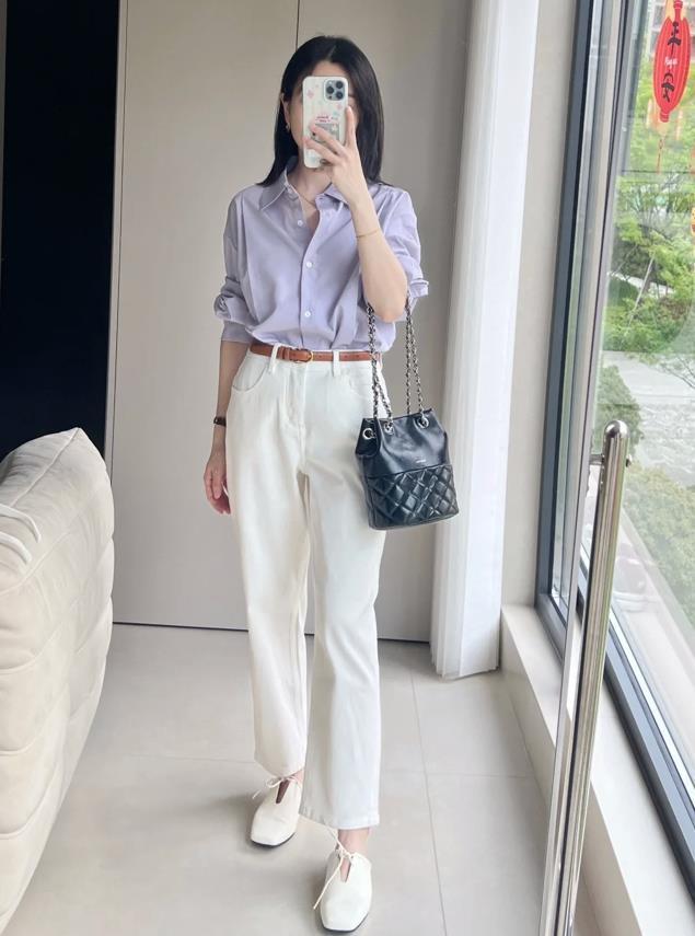 喜歡襯衫的姐妹,若是穿膩了白襯衫,那麼就給自己入手一件紫色的襯衫試試看吧,顏色很正,飽和度並不會太高,加上稍微寬鬆的版型,上身後不會顯得嚴肅,搭配白色九分褲,整體看起來很清爽。