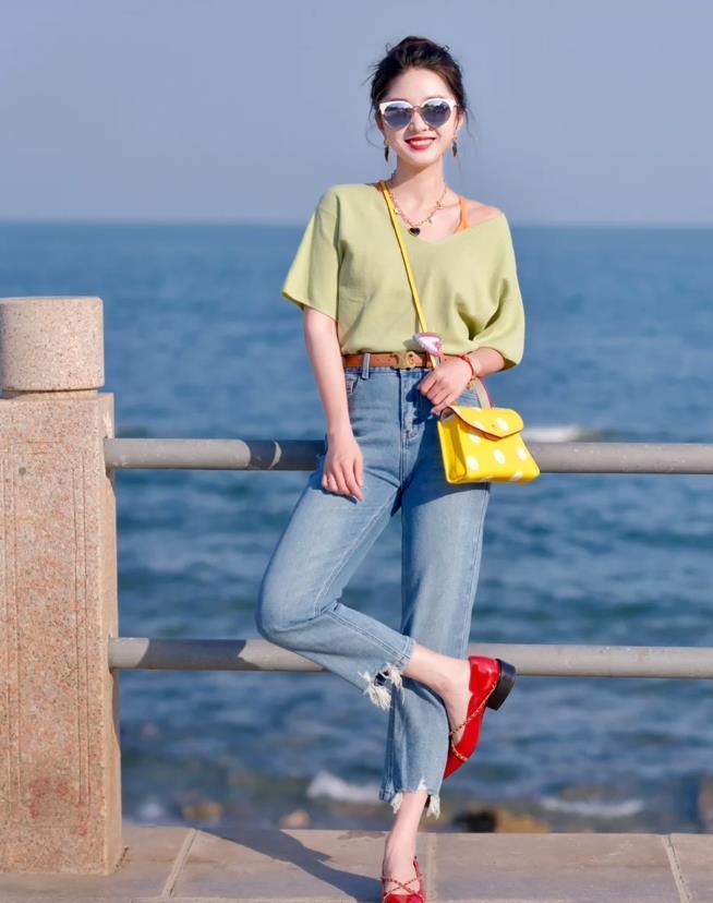 這一套穿搭纔是夏天該有的樣子,紅黃綠的配色,看似有些違和,實際上組合在一起的時候,你才知道有多驚豔。膚色不白皙的,可以選擇低飽和度的彩色上衣,搭配九分牛仔褲,紅色的單鞋和黃色的包包,爲整個造型加分不少。
