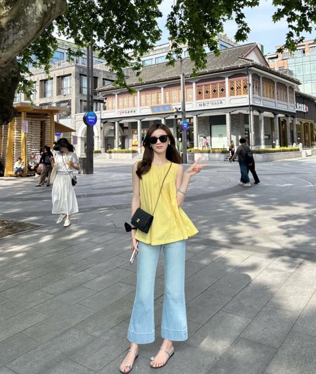 隨性舒適又自在的穿搭,纔是最適合夏天的吧,清爽涼快的棉麻無袖上衣,明亮的黃色襯托下,不僅提亮了膚色,還讓你看起來洋氣感十足。與九分微喇褲搭配,再隨便踩着一雙涼鞋,很日常呢。