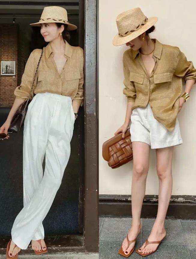 很自由的法式風穿搭,帶着一種舒適的鬆弛感,這正是深受衆多女性們喜歡的穿搭,棉麻材質的襯衫,在夏天裏穿再合適不過了,選擇白色的西裝闊腿褲,那種大女人風的範就呈現出來了。