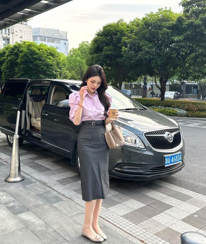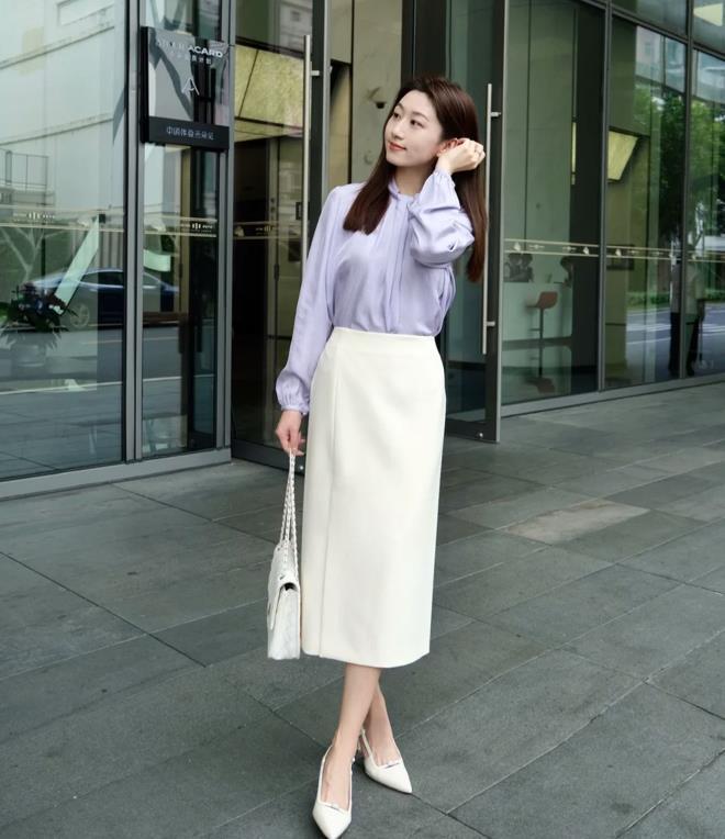 淺紫色的襯衫和灰色西裝半身長裙的搭配,纔是專屬於職場的打扮吧,毫不費力就可以穿出優雅與氣質。記得要將腰線提高起來,這樣才能輕鬆拉長腿部線條,在視覺上也能打造出高挑感。