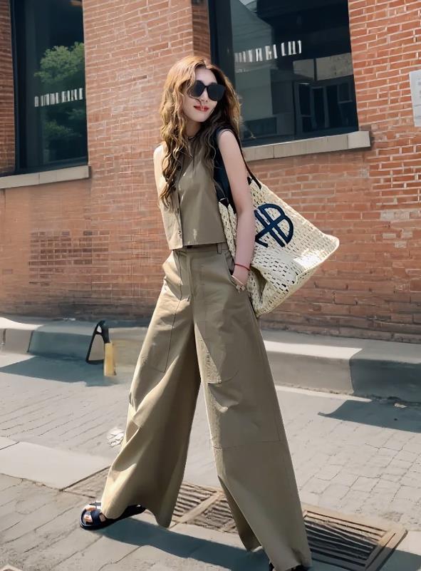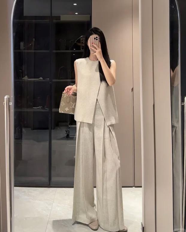 今年大女人風穿搭又火了,不知道要怎麼穿才時髦高級的話,直接選擇套裝即可,這一套闊腿褲+無袖衫的組合,燕麥的配色,自帶溫柔和氣質。高腰闊腿長褲,不僅拉長了腿部線條,還巨顯腿長,還非常顯氣場。