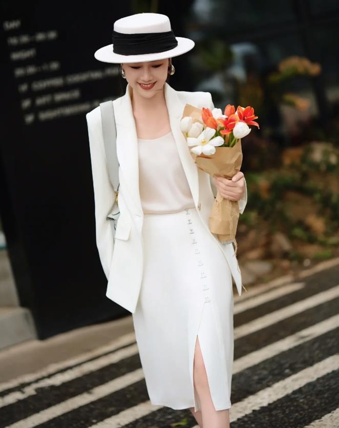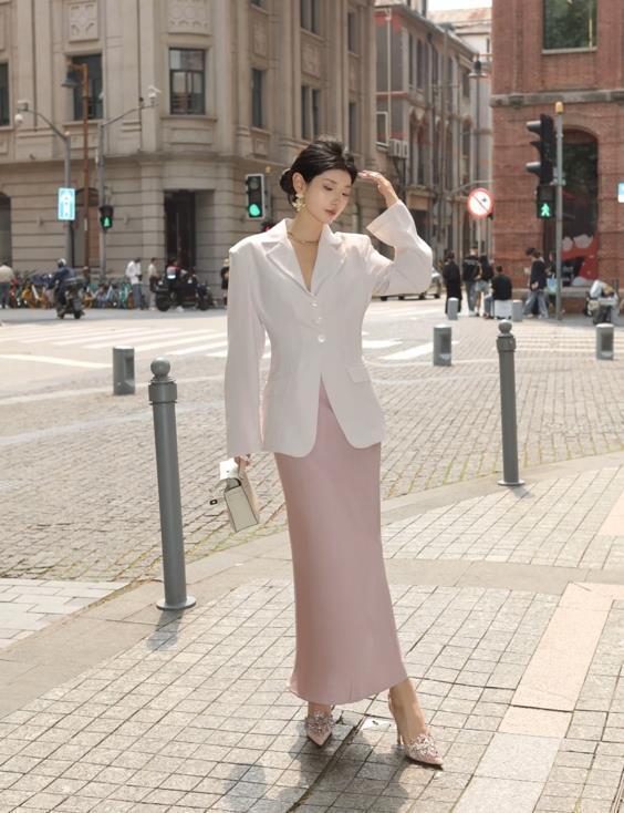 既可以日常又不失通勤的一套,白色+粉色,這兩種顏色搭配一起,實在是太減齡和顯嫩了,有些修身的西裝外套,結合粉色緞面半身長裙,搭配一雙尖頭細高跟鞋,優雅氣質的大女人風氛圍感就直接拉滿了。