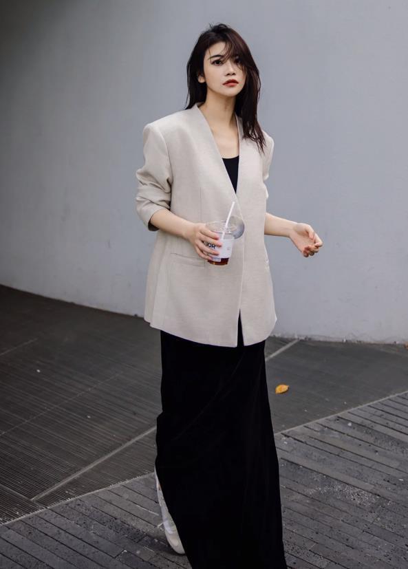很適合職場女性的一套大女人風穿搭,亞麻材質的西裝,就算是在夏季裏穿也不會覺得悶熱。版型適中,剪裁也很利落乾淨,與黑色連衣長裙搭配,那種強大的氣場就展現出來了。