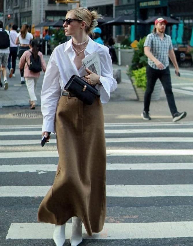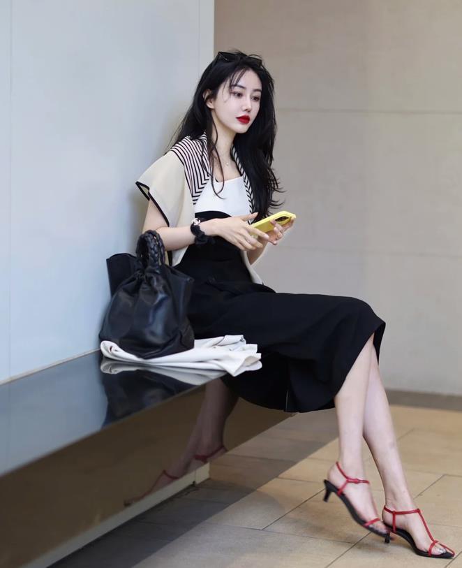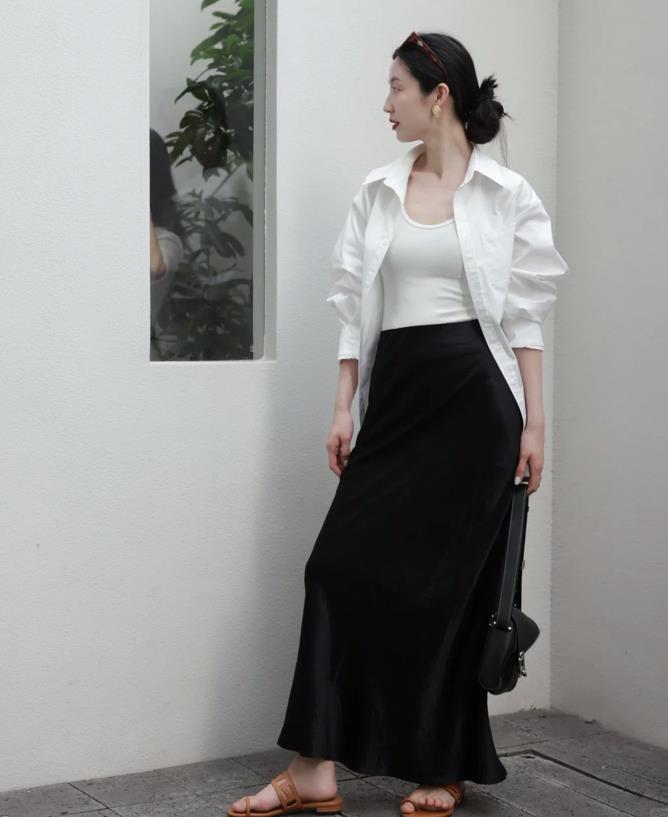 可以單穿,也可以疊穿背心,選擇同色的背心相配,沒有一點違和感,更好看了,黑色半身長裙,不僅遮擋住腿部缺點,還自帶優雅和氣質。