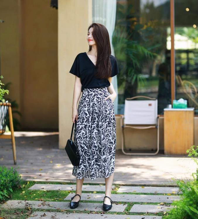 極簡的黑白系穿搭,這兩種配色在夏季照樣是很合適的,黑色v領上衣配黑白碎花半裙,不僅顯瘦,還帶着些許的溫柔與氣質。不管是上班聚會,還是約會場合都能輕鬆hold住。