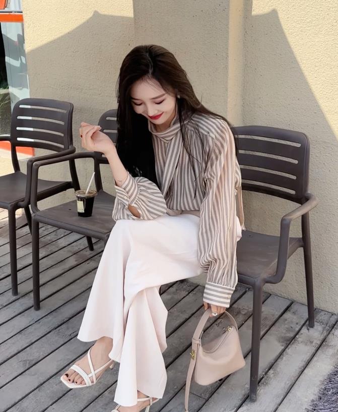 30歲又怎樣?照樣可以穿得很少女,設計很別緻的條紋襯衫,就是比純色款要時髦太多了,搭配白色闊腿褲和細高跟涼鞋,將大女人風的氣場演繹得淋漓盡致。