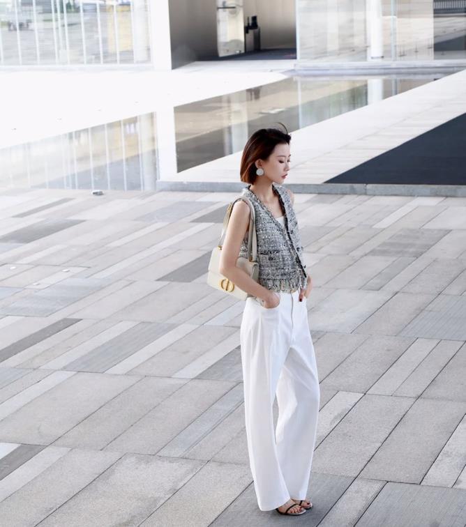 今年依舊偏愛闊腿褲,慵懶隨性的調調,看起來也太不失高級和氣質了,白色闊腿長褲,版型很正,對所有不完美的腿型都具有極佳的包容性。疊穿小香風馬甲,爲整體造型增加了層次感。