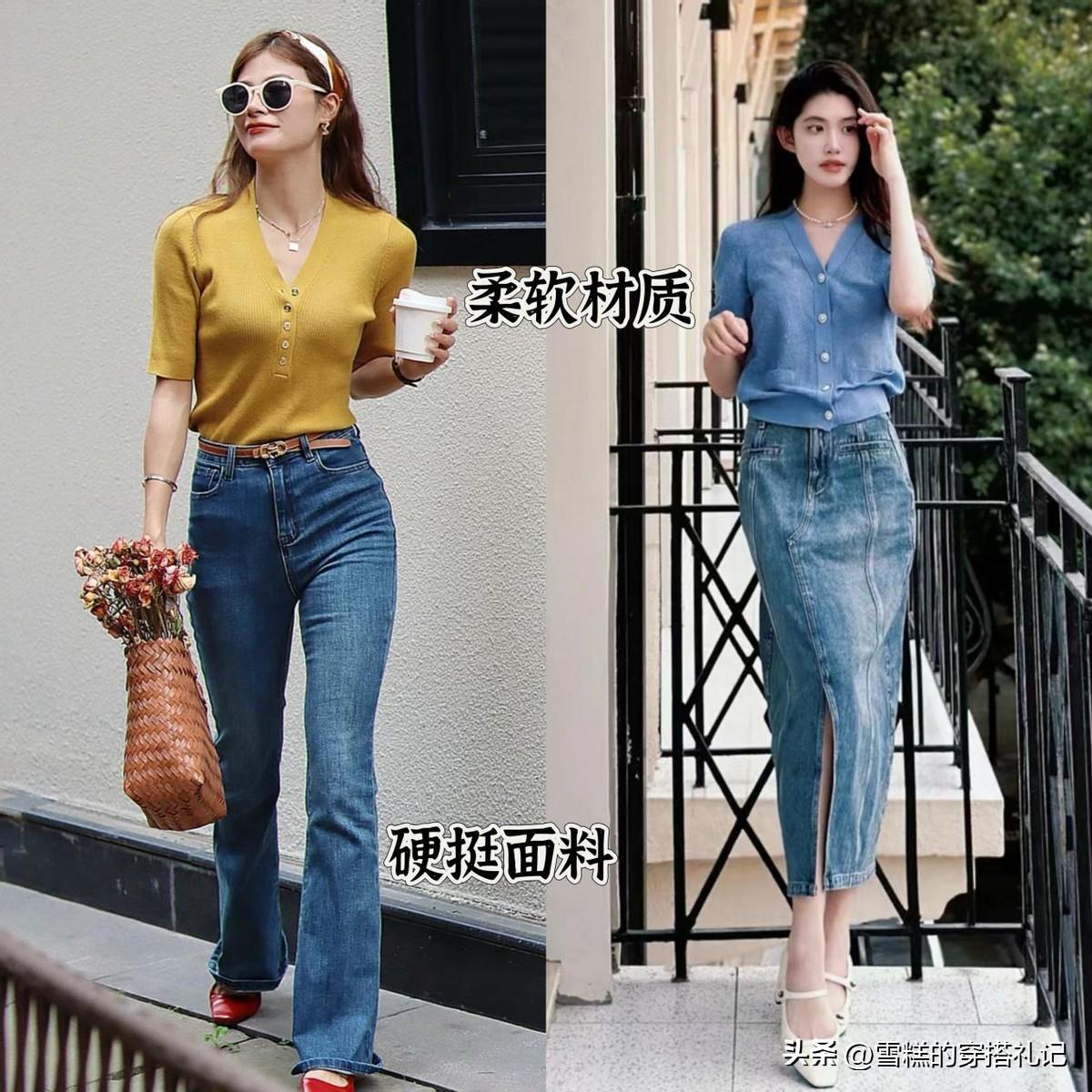 因爲奶奶衫的面料是屬於比較柔軟的類型,所以我們在搭配下裝時,儘量不要選擇軟塌無形的長褲長裙,學會換成牛仔材質的微喇褲、闊腿褲或者直筒裙,既能削弱臃腫感,又能營造平衡狀態。