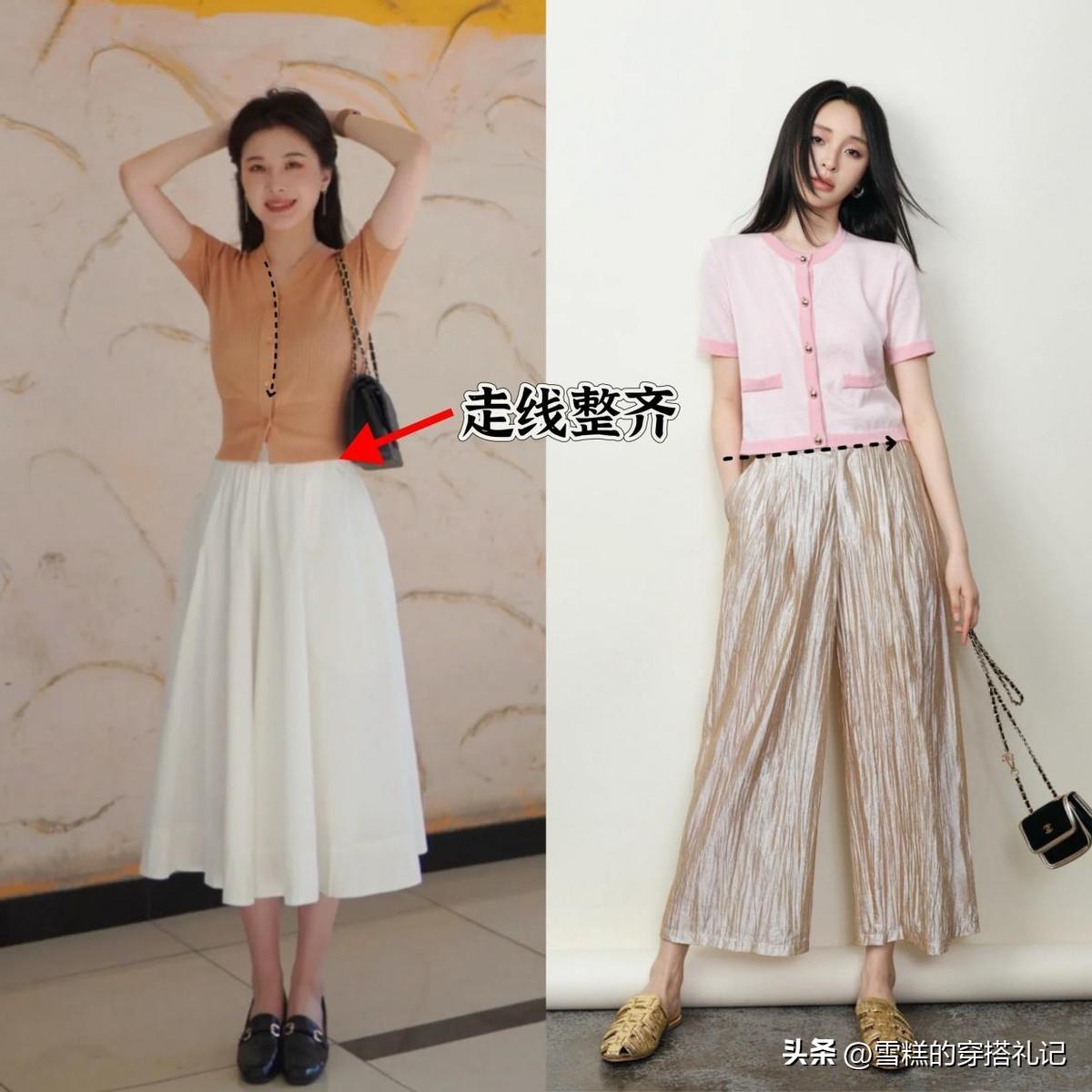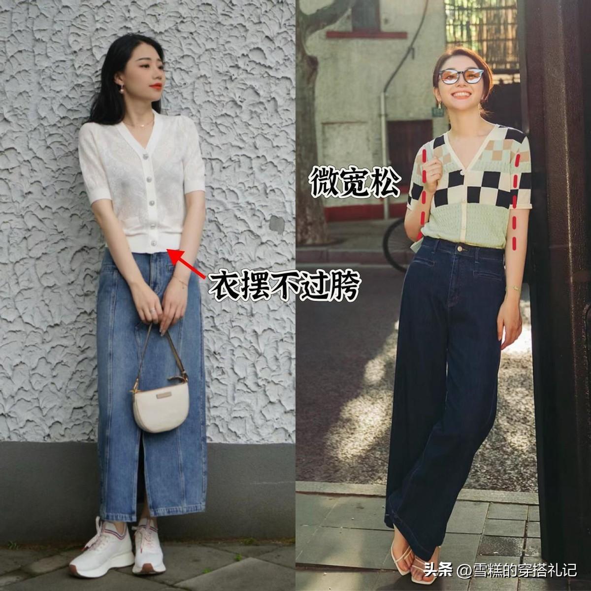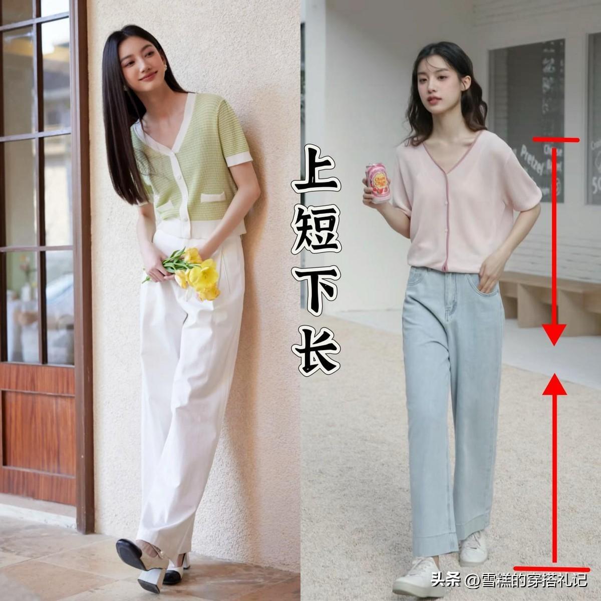 如果你的個子不是很高,那麼,不妨可以嘗試一下“上短下長”的技巧,長度不過胯的短款奶奶衫,搭配高腰款式的下裝,就能夠解決身材比例的問題,輕鬆穿出黃金三七分比例。