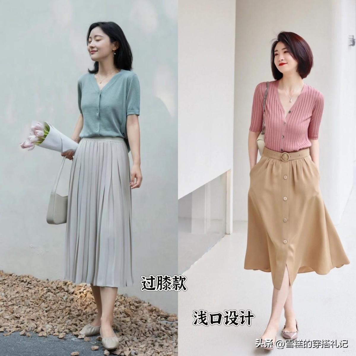 過膝長度的百褶裙、傘裙、直筒裙……和V領奶奶衫都是最佳拍檔,組合出來的效果優雅又大氣,最後,再踩上一雙和裙子同色的淺口鞋,和諧感更好。