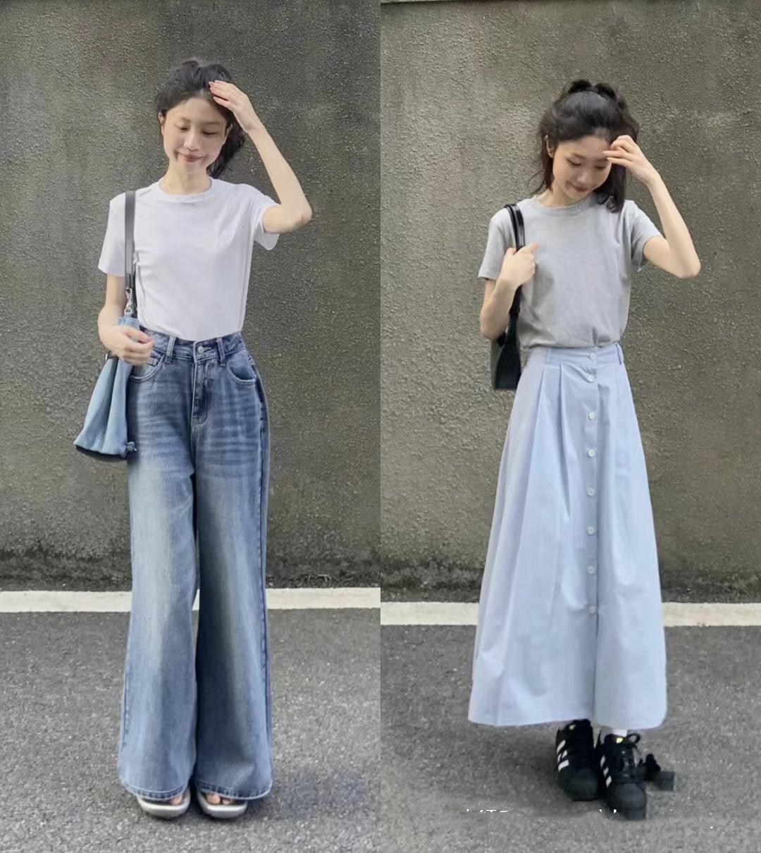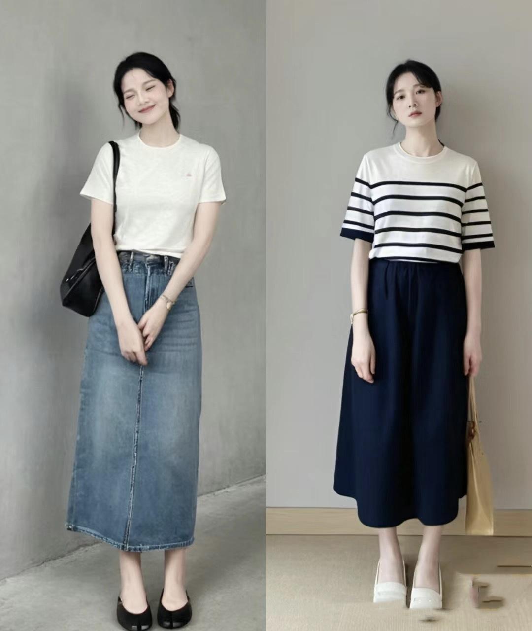 基礎款的T恤,百搭又不挑人。配高腰的A字形半身裙,可以抬高腰線、優化身材比例。簡單的A字形半身裙,以流暢的剪裁,勾勒出更窈窕的腰身曲線。