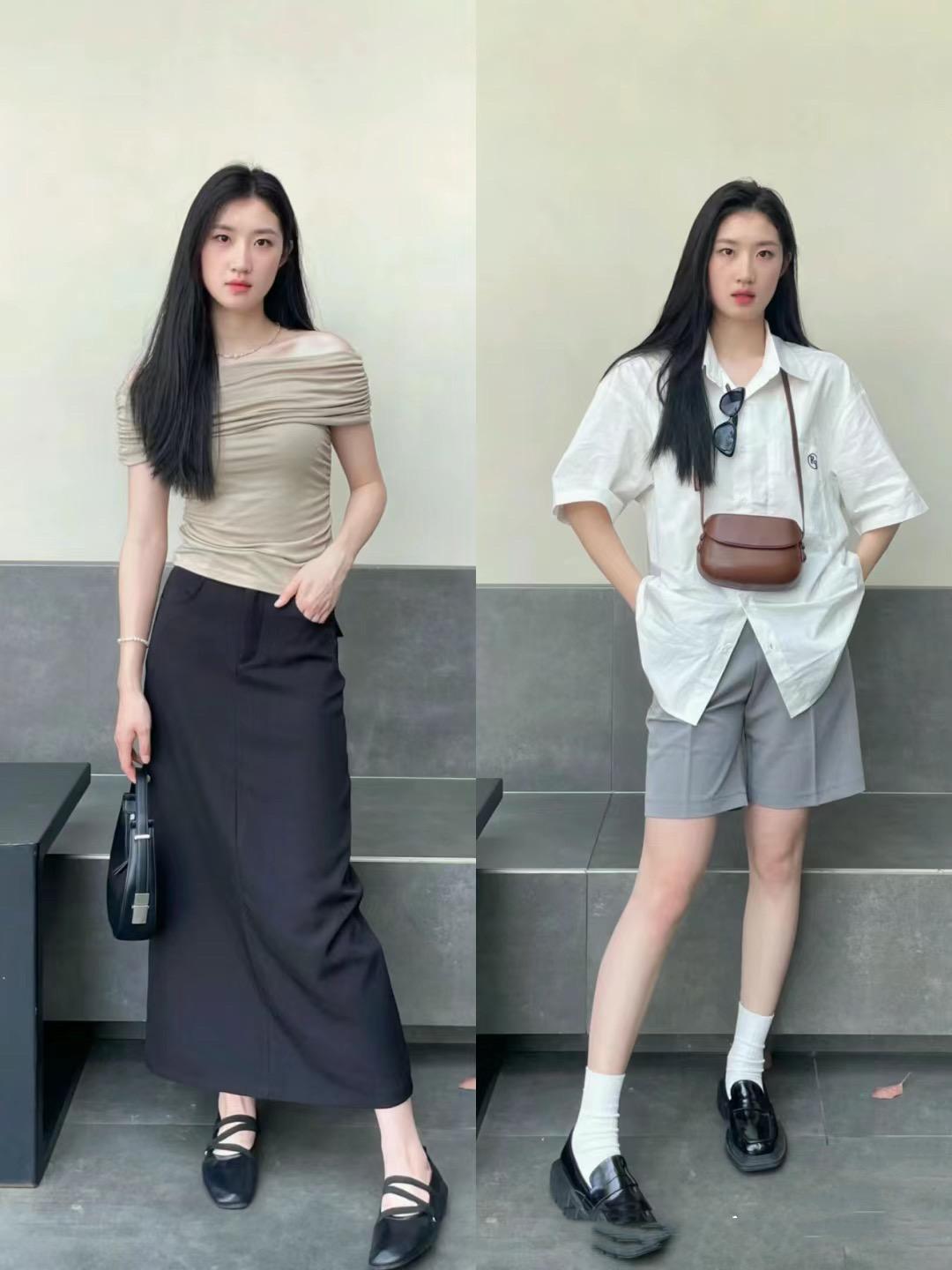 看似簡約大方的半身裙,也可以通過捏褶+紐扣+A字形流暢裙襬的方式,表現出更震感的遮肉顯瘦效果,讓基礎款穿搭更有力。