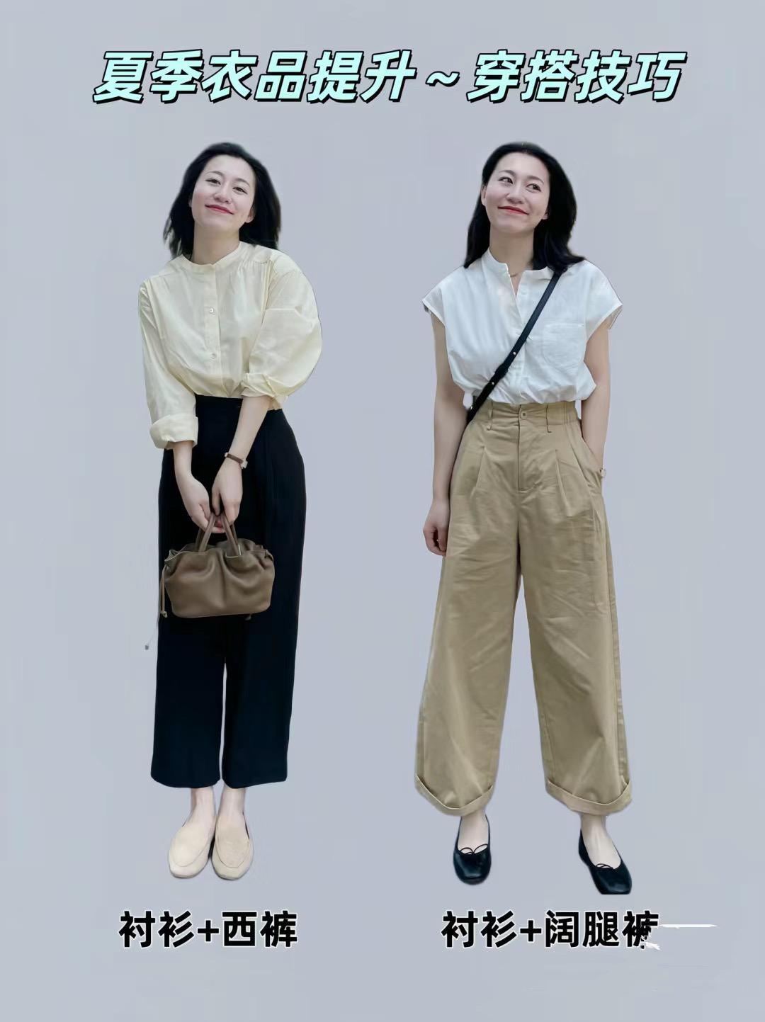 寬鬆一點的襯衫,可以配西裝褲或者闊腿褲來穿着。襯衫+西裝褲,寬鬆利落、對於身材的包容性更強。日常穿搭、西裝褲也很顯瘦、品味更高級。