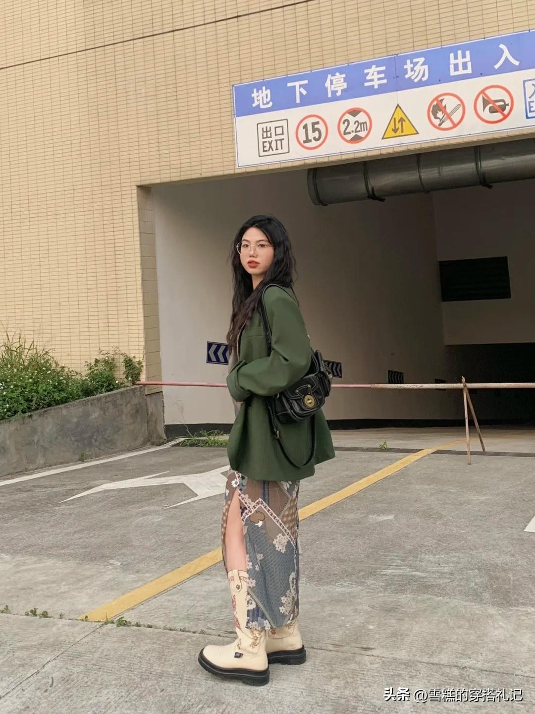 【深淺結合,深化造型質感】 墨綠色的穿搭其實在日常生活中算是比較常見的,我們可以先挑選一件以墨綠色爲主色調的外套,內裏搭配一些顏色變化比較複雜的裙裝來製造繁簡的反差。